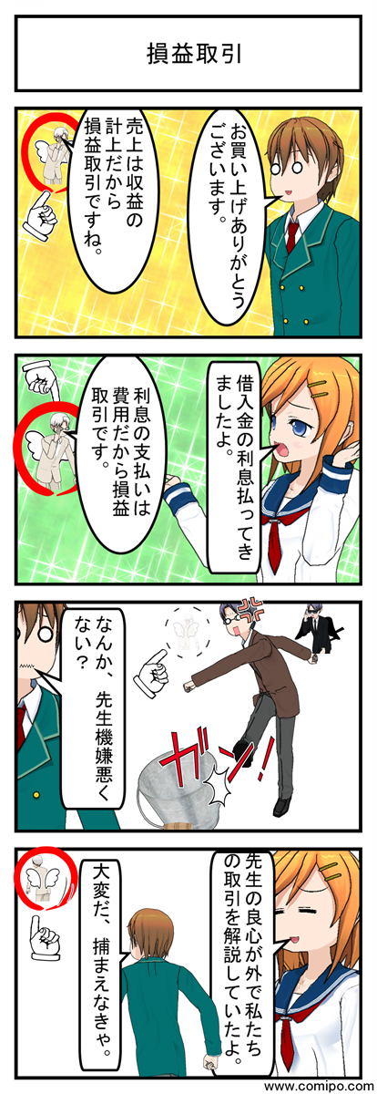 このまんがでは1コマ目の売上は、収益が発生するため、2コマ目の支払利息は費用が発生するため、い