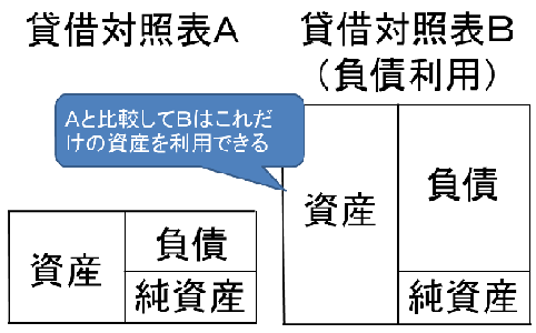 この図のように、負債で資金を調達して商売をやればより多くの利益を上げることができると思いませんか?例えば貸借対照表Aの会社が10の利益を、貸借対照表Bの会社が50の利益を上げた場合、純資産は同額なのでROEは5倍になります。(自己資本比率が悪くなるのでやりすぎてはいけませんが…)